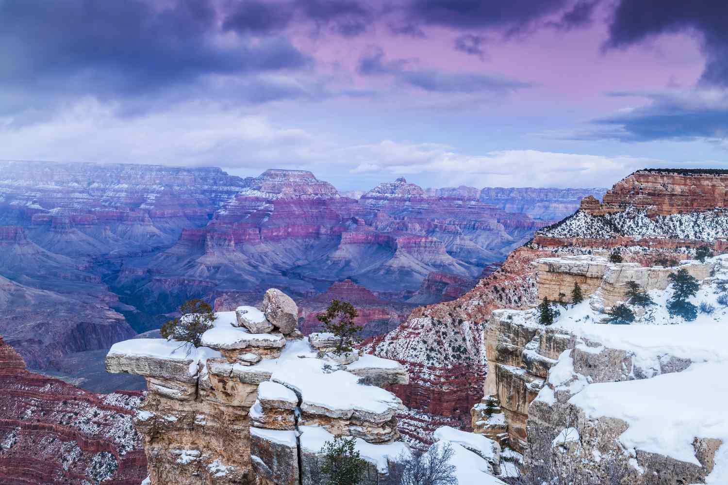 The Grand Canyon is an awe-inspiring sight on its own. Now imagine seeing the fiery sandstone and surrounding evergreen trees with a layer of fresh snow. The winter scenery at this Natural Wonder of the World is absolutely magical. Visiting the South Rim in the off-season means popular hikes like the Bright Angel Trail are blissfully quiet and much more comfortable than in the summer, thanks to cool temperatures. Grand Canyon National Park’s free shuttles run fewer routes in the winter, but there are still plenty that stop at the different trailheads and Grand Canyon Village viewpoints.