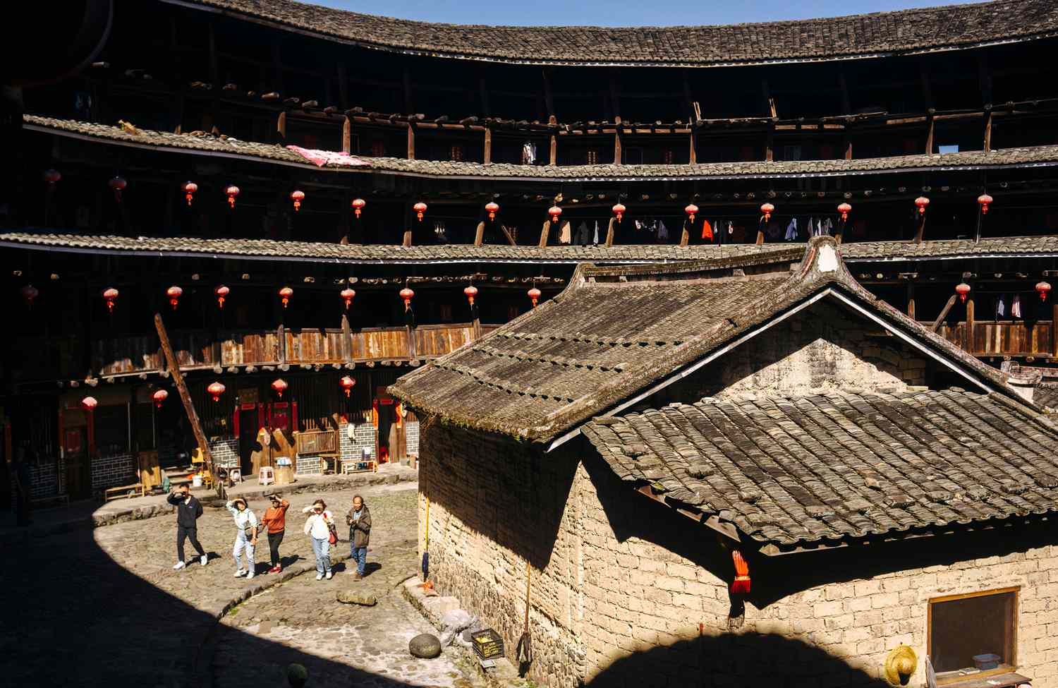 As the Yi Dun continued south, the surprises continued. In the Sanfang Qixiang district of the city of Fuzhou, a group of us had one of the trip’s most memorable meals, which began with faux shark’s fin soup and sesame shrimp and continued with platters of fried cod, wilted greens, seafood noodles, and lotus-root tips, which were arranged on the lazy Susan in the middle of our round banquet table. Another day, we toured the UNESCO-listed Tulou district, where the Hakka community developed an architectural form that fuses the ideas of collective defense with apartment living. These tulou, some of which date back to the 13th century, are like enclosed villages for hundreds of people: sturdy walls surround an open-air courtyard at the center of a square or circular floor plan. Today it’s possible to visit several of these buildings, where people continue to live and work—and welcome visitors to shop for souvenirs, many of them handmade on site.